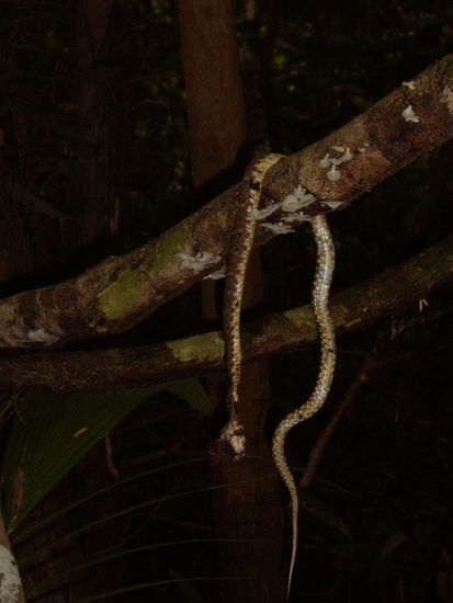 Am Mittag starteten wir dann die erste Wanderung in den Urwald. Diese begann alles andere als erfreulich und nach 15 Minuten hatten wir wohl alle schon wieder genug. Schock Nr.1: Als ich direkt hinter Halcón gerade über einen Ast stieg, machte uns Miriam hinter mir aufgeregt auf eine kleine Schlange auf dem Ast aufmerksam. Noch aufgeregter deutete mir Halcón schnell weiterzugehen. Das kaum ein Meter lange Exemplar ist wohl hochgiftig, ein Biss innerhalb 12 Stunden tödlich. Mit gemischten Gefühlen schaute ich dann zu, wie Jerry die Schlange zum Schutz der Touristen tötete und an einem Ast aufhängte.
