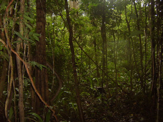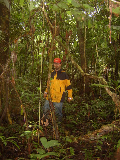 Am 4.Tag regnete es dann fast den ganzen Morgen in Strömen, so dass wir uns erst gegen 11 auf auf die Wanderung in einen Primärwald machen konnten. Eine tolle Wanderung, die fast mehr aus Stapfen durch Flüsse als aus wandern bestand. Es gab abermals Affen, Schlangen, Insekten und Frösche zu sehen. Von letzteren sah ich von 2-3 cm großen giftigen bis zu 20 cm riesigen Kröten. Außerdem informierte uns Halcón immer wieder über die medizinische Verwendung verschiedenster Bäume. Gerüchten zufolge sei durch ein bestimmtes Baumgift hier schon Aids geheilt worden?