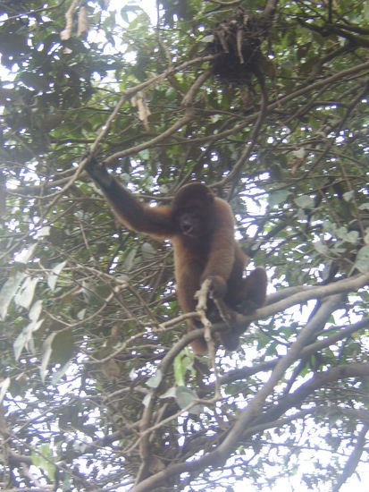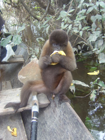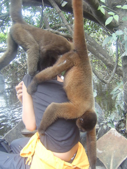Am 2.Tag gings morgens per Kanu ca. 2 Stunden bis zu einem schönen See, wo wir uns erhofften Delphine vorzufinden. Höhepunkt des Ausflugs war sicherlich als von unseren mitgenommenen Bananen angelockte Affen von uns gefüttert werden wollten und sogar zu uns ins Kanu stiegen, auf den Mädels umherkrabbelten und genüsslich ihre Bananen verschlangen. Ein letzter schien gar nicht mehr gehen zu wollen und wurde immer ängstlicher, als wir uns zunächst etwas vom Ufer entfernten.
