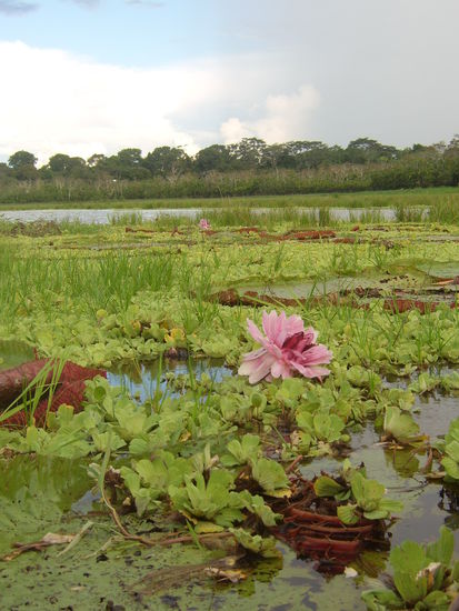 Da wir die Nacht noch weiter in der Natur verbringen wollten, machten wir uns mittags auf zu einem weiteren, wunderschönen See, sehr schwer erreichbar, da komplett zugewachsen mit Seepflanzen. In der Nähe des Sees schlugen wir dann einfach an einem Ufer des Baches in voller Natur das Nachtlager auf, das jeweils aus Hängematte mit Mosquitero und einer Plane darüber bestand.