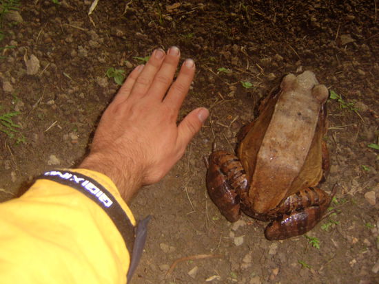 Ein besonderes Erlebnis war auch desöfteren der Gang zum Klo, das ca. 50 Meter entfernt vom Camp lag. Neben verschiedenen Insekten (vor allem Spinnen, aber auch verschiedenste Schmetterlinge) entdeckte ich beispielsweise 2 verschiedene Leguane, die sich auf dem Platz davor sonnten. In einer Nacht entdeckte ich dort 2 grün leuchtende Augen, die -wie sich später herausstellte- zu einem knapp 5 cm großen Käfer gehörten. Weniger später erhob er sich in die Luft und die Leuchtfarbe schlug nach orange um, als er auf mich zukam. Strahlend orange, der Bauch des "Monsters"...