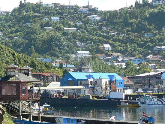 Als es dann wieder einmal anfing zu regnen verdrückten wir uns in die Markthallen. Dort herrscht ein üppiges Angebot an frisch gefangenem Fisch und Meeresfrüchten und auch geräucherten Lachs bieten fast alle Händler an. Darüber hinaus wird man von den ansässigen Wirten permanent angesprochen, ob man nicht bei ihnen ein ganz frisches "Curanto" oder "Merluza a la pobre" essen will. Das Curanto wird live vor dem "Wirtshaus" zubereitet und man kann direkt in die Töpfe schauen.