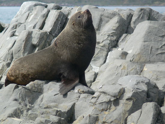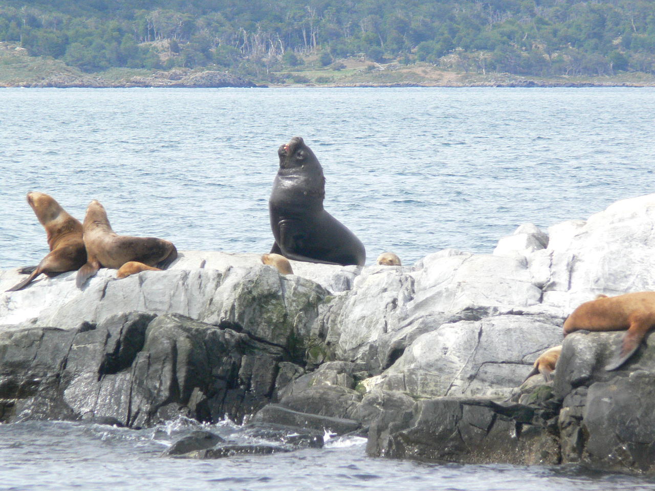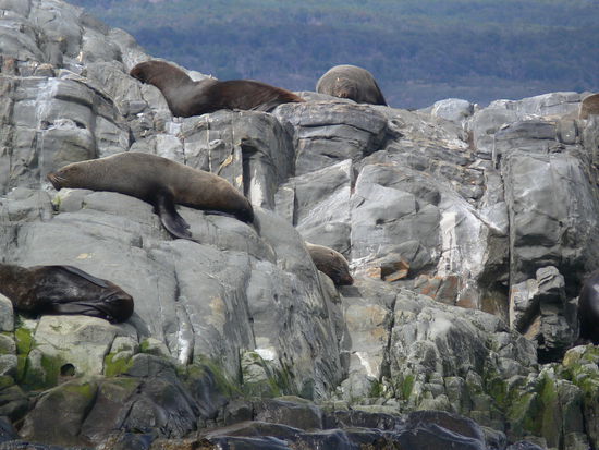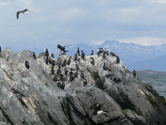 Nach etwa einer halben Stunde hier auf dem Beaglekanal, an dessen tiefster Stelle die Grenze zwischen Argentinien und Chile verläuft, erreichten wir die erste Insel unseres Ausfluges. Diese teilen sich Seelöwen und Komorane gleichermassen. Das Alfamännchen der Seelöwenkolonie ist dabei den ganzen Tag mit dem Vertreiben von Nebenbuhlern - er hat die Ansprüche auf diverse Weibchen zu verteidigen - und natürlich Balzerei beschäftigt.