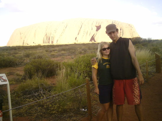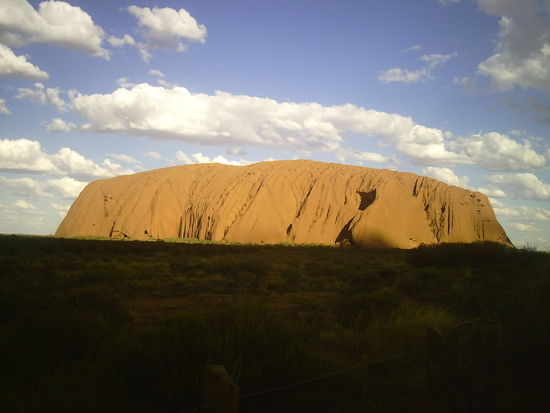 In Alice Springs angekommen konnten wir uns gleich davon überzeugen, dass es wirklich nur eine Stadt von 12 500 Einwohnern ist, denn viel ist dort nicht los, abgesehen vom Tourismus, also sind wir gleich weiter gefahren Richtung Uluru. Vor einem Jahr haben wir noch gedacht, dass der Stein gleich in der Nähe der Stadt ist, aber für Australische Verhältnisse sind knappe 500km wahrscheinlich nah! An solch einem Tag freut man sich besonders, dass man doch das Auto mit Klimaanlage und nicht eine der verrosteten alten Schüsseln auf den Backpackermärkten, die auch irgendwie teilweise vorwärts kommen, gekauft hat. Nach über 5 Stunden, einem Berg, den wir versehentlich für den Uluru hielten und 50$ Eintritt waren wir dann endlich beim bekanntesten Stein der Welt angekommen. Der Anblick ist wirklich super, denn er ist wirklich etwas ganz anderes, als alle anderen Berge. Es ist halt mehr ein riesiger Stein mit unheimlich klaren Konturen und Strukturen. Beim Sonnenuntergang waren zwar keine Hunderte von Touris, aber dafür Millionen von Fliegen, die einem am liebsten in Augen, Mund und Nase fliegen! Schlafen mussten wir das erste Mal, abgesehen von der Arbeitszeit, auf dem Caravanpark, da es dort wirklich nichts außer einem riesigen Ressort mit Hotel, Motel und so weiter gab. Die konnten sich hohe Preise und dreckige Einrichtungen gut leisten, aber was will man machen, denn wir wollten ja ganz früh wieder raus um uns noch bei ungenehmen Temperaturen die Kata Kjutas ( Olgas) anschauen und einen kleinen Spaziergang am Uluru machen. Die meisten Touris haben aber nur das eine Ziel: Die Bergbesteigung, obwohl wirklich überall steht, dass man das bitte unterlassen sollte, da es für die Aborigines eine heilige Stätte ist und es außerdem auch echt gefährlich ist und schon einige Leute durch die Hitze und durch Abrutschen gestorben sind! Aber die Touristenbusse karren vor allem Massen von Japanern an, die in Scharen genau neben den Bergbesteigung verboten Schildern ihre Tour starten.