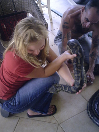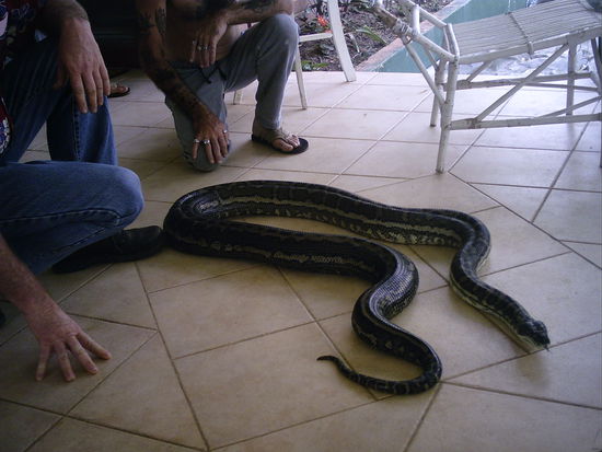 Ein paar Tage später hatten wir dann zu Hause von einem größeren Exemplar Besuch. Das ist aber ein Haustier... die bringt einem bestimmt nicht früh die Zeitung ans Bett! Aber interessant war das schon, nur können wir uns nicht vorstellen, dass es dieser 3meter langen und 10kg schweren Schlange so gut geht, denn sie sollte eigentlich auf dem Campingplatz wohnen, doch als die anderen Camper den neuen Mitbewohner in der Sonne liegen gesehen haben, musste sie ihre Sachen packen und durfte 2 Nächte in unserer Küche hausen... in der Nacht habe ich, mich nicht getraut auf Toilette zu gehen, in Gedanken, dass sie vielleicht in unser Zimmer gekrochen ist...