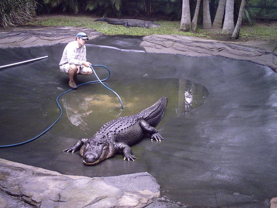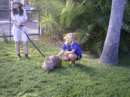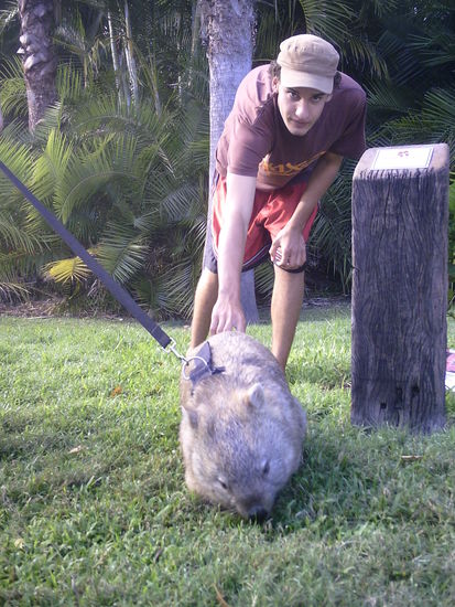 Das einzige was der Phil unbedingt von Anfang an in Australien machen wollte war der Besuch des Australia Zoos vom Crocodile Hunter Steve Irwin und nach 7 Monaten standen wir dann auch schon ganz zeitig vor den noch geschlossenen Toren des super tollen Tiererlebnisses. Schon vor dem Eintritt haben wir mit einem kuscheligen Wombat Fotos machen koennen. Die lustigen Tierchen werden im Park taeglich an der Leine spazieren gefuehrt, aber sie sind der Boss und entscheiden wo es lang geht und wann es wieder in ihr ueberaus grosses "Gehaege" zurueck geht.