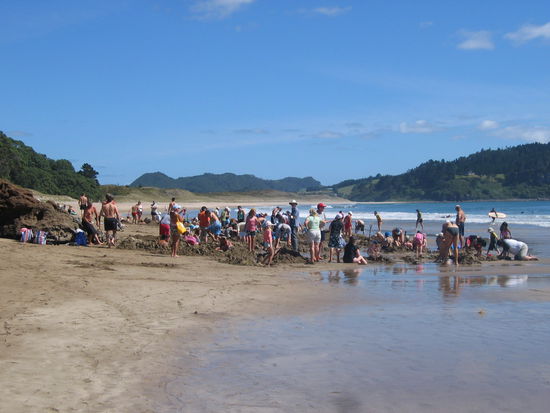 Der naechste Tag sollte der bisher schoenste meiner Neuseeland-Reise werden. Morgens sind wir an den Hot Water Beach gefahren. Jeder mit einem kleinen Spaten ausgeruestet wollten wir uns auf die Suche nach heissen Quellen am Strand machen. Mein erster Eindruck war das nachstehende Bild: