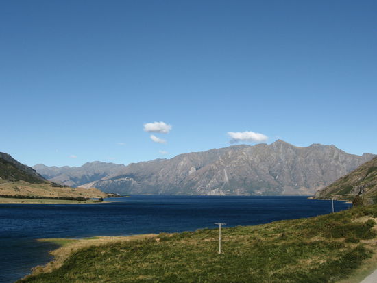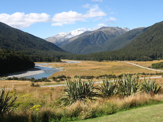 Die bisher landschaftlich schoenste Fahrt fuer mich war zwischen Haast und Wanaka. Entlang des Mount Aspiring Nationalparks fuehrt diese Strasse durch dichte Waelder. Rauschende Fluesse, Wasserfaelle und unzaehlige Wege laden hier zum verweilen oder wandern ein. Und der Ausblick auf die umliegenden Berge war einfach fantastisch. Hier zwei Bilder...