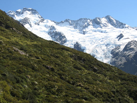 Die Anfahrt zum Mount Cook Nationalpark ist schon sehr spektakulaer. Durch eine durch Graslandschaft gepraegte Ebene faehrt man entlang des Lake Pukaki auf die wohl schoenste Ecke der Neuseelaendischen Alpen zu. Von weiten konnten wir schon den Mount Cook, oder auch Aoraki genannt, erkennen. Mt. Cook ist mit 3764 Metern der hoechste Berg Neuseelands, der Nationalpark selbst beherbergt insgesamt 22 Dreitausender!