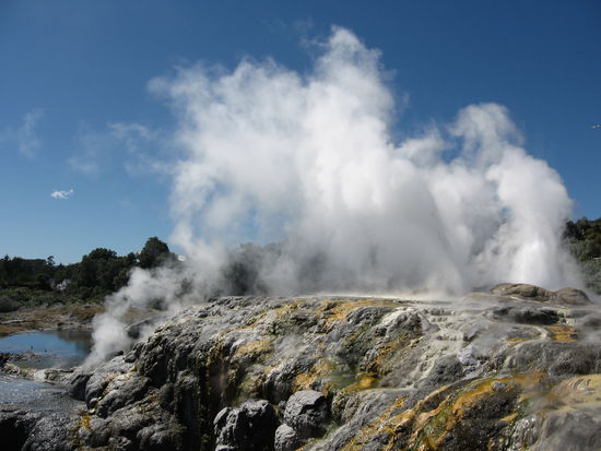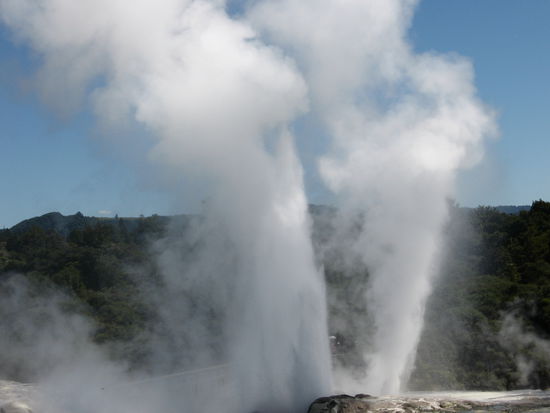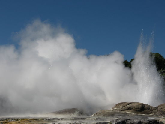 Eine der Hauptattraktionen auf dem Gelaende sind die beiden Geysire "Prince of Wales Feathers" und "Pohutu". Pohutu heisst soviel wie grosser Spritzer, was auch stimmt. An manchen Tagen steigen ca. 20 Meter hohe Wasserfontainen auf. Zum Glueck ist man ein gutes Stueck von diesen Geysiren entfernt, denn wer moechte schon mit 98 Grad heissem Wasser in Beruehrung kommen?