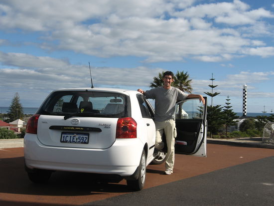 Hier ein Bild von "meinem" Toyota und mir in Bunbury. Ein recht nettes Auto, nur fehlen ihm die PS . Im Hintergrund koennt ihr den Leuchtturm von Bunbury erkennen.