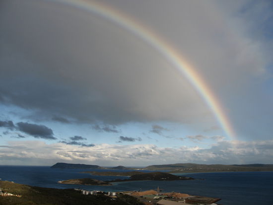 Nachdem sich seit Tagen Sonne und Schauer abwechseln, bietet sich immer wieder die Gelegenheit fuer ein Foto mit einem Regenbogen. Hier einer ueber der Bucht vor Albany.