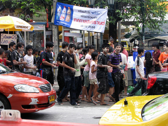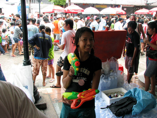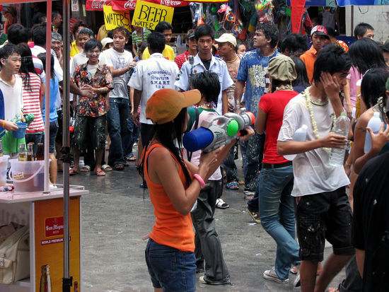 Vom 13. bis 15.April durfte ich, nachdem ich schon das "normale" Neujahr in Neuseeland, das chinesische in Melbourne, nun auch die Thai Jahreswende (Song Kran genannt) in Bangkok feiern. Dieses Fest wird auch Wasserfest genannt, da an diesen drei Tagen absoluter Ausnahmezustand herrscht, weil sich die normalerweise schüchternen, freundlichen Thais in gnadenlose Killer mit riesigen Wasserspritzpistolen verwandeln...und keiner wird verschont!! Jeder wird erbarmungslos klitsch nass gespritzt und mit einer Art Schlamm bzw. Puder beschmiert...und um es zusammenfassend zu beschreiben ist es ein unglaublicher Spaß zu sehen wie sich eine Millionenstadt für die Dauer von 3 Tagen total auf den Kopf gestellt wird. Natürlich ist dies die moderne Variante für das Thai Neujahr, die älteren Thais besuchen an diesen Tagen ihre buddhistischen Tempel, um den Mönchen Opfergaben zu bringen und ihre Gebete abzuhalten. Wir haben einen Tag traditionell mit Nats Eltern an einem sehr schönen Wasserfall verbracht und einen Tag sehr nass bzw. absolut modern auf der Khao San. Also zum dritten Mal dieses Jahr...Happy New Year, ach übrigens schreiben wir nun das Jahr 2550.