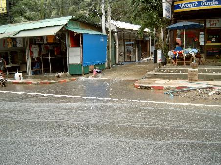 So ist derzeit die Strasse am Kai Bae Beach ueberschwemmt. Geht schon wieder.