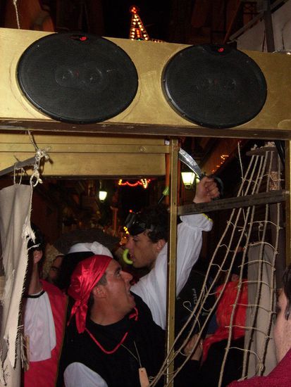 super Idee! das Piratenschiff, mit Boxen ausgestattet, rollte durch die Strassen bis zur Zona Pirata und zog so tanzende Menschen mit sich