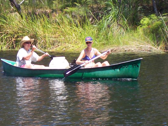 Auf unserer Kanutour waren wir 5 Leute auf 2 Kanus verteilt. Gestartet sind wir in Boreen Point am Westufer des Lake Cootharaba (Teil des Noosa River). Das ist ein sehr grosser und flacher See. Man kann fast ueberall laufen.Die tiefste Stelle ist 2m. Am noerdlichen Teil faengt dann der Great Sandy Nationalpark an. Unser Ziel war eine Campsite 7 km flussaufwaerts. Da ich im 2-er Kanu (und fast der kompletten Ausruestung) war, waren wir etwas langsamer und haben das erste Kanu irgendwann aus den Augen verloren.