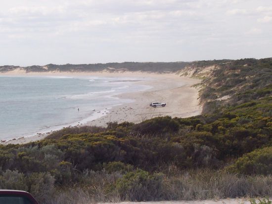 Da es den ganzen Tag sehr heiss war und deshalb alles sehr anstrengend,waren wir froh als wir einen schoenen Campspot gefunden hatten. An einem einsamen Sportplatz, weit genug weg von der Strasse, Toiletten + Wasser waren vorhanden, wenn man Tennisschlaeger bei sich hat, kann man auch Tennis spielen. Was will man mehr. Am naechsten Morgen sind wir an der Kueste angekommen. Ueber Portland nach Cape Bridgewater. Der kleine Ort ist bekannt fuer den Petrified Forest, die Blow Holes, die Bridgewater Lakes, die Limestone Caves (von da hat man einen wunderbaren Blick ueber die Seen bis zur Kueste) sowie die Seals Colony. Um die Seals zu sehen, muss man aber auf einen mindestens 3-stuendigen Walk. Das haben wir dann gelassen. Von Cape Bridgewater sind wir nach Mt Gampier zu den Blue Lake. Das ist ein Kratersee, der (wie der Name schon sagt) wirklich blau ist. Teilweise ueber 200m tief. Unser naechstes Ziel war Carpenter Rocks bzw. der Canunda NP, wo wir auch gecampt haben. Windgeschuetzt hinter den Duenen und im Lichtschein eines Leutturmes. Ein kleines Lagerfeuer war leider auch an der Kueste nicht erlaubt.