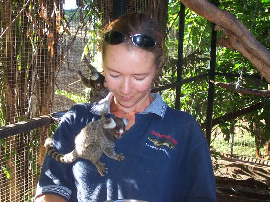 Wenn ich nicht dort arbeite - manchmal sind es nur 4 Stunden am Tag - gehn wir in den Croc Park. Dort wird es aber jetzt auch abwechslungsreicher, da die Kaefige fertig sind. So fuettern wir jetzt auch die Krokodile oder ich hab den ganzen Tag Gehege mit kleinen, einjaehrigen, noch nicht gefaehrlichen Crocs mit dem Hochdruckreiniger ausgewaschen. Die Fuetterung kann - gerade fuer mich als Vegetarier - schon recht eklig sein. Die Details (z.B. Huehnerkoepfe) lass ich besser weg. Umso niedliger waren die Affen. Genauer gesagt ein kleine Rasse, dessen Namen ich mir bisher noch nicht merken konnte.