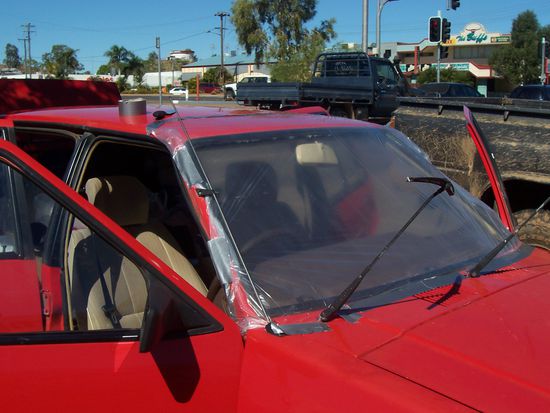 Wir waren ca 50km vor Mt Isa -also auch etwas im Zeitplan hinterher - als uns ein entgegenkommendes Auto einen Stein oder irgendwas auf die Windschutzscheibe geschleudert hat. Und diese ist daraufhin in tausende Teile gesplittert. Unser Glueck im Unglueck war, dass die Scheibe in der Fassung geblieben ist und uns nicht um die Ohren flog. Da standen wir nun leicht geschockt mit kaputter Windschutzscheibe am Strassenrand. Und was nun? Genau, die Scheibe musste raus. Das meiste mit einem Bettlaken aufgefangen, hatten wir windige 50km vor uns. Immernoch der Hoffnung, dass wir in Mt Isa eine neue bekommen. Fuer's Outback gesehen ist es ja ein grosser Ort. Es gab auch eine Werkstatt fuer Scheiben, aber die hatten natuerlich keine die in mein Auto passte. Da wir nicht 3 Tage dort rumsitzen wollten, ausserdem an das Auto gefesselt, da ich es ja nicht mehr "abschliessen" konnte, sind wir auf die Suche nach einer klaren Plastikfolie. In einem Malergeschaeft hatten wir Erfolg. Eddy hat mir per Telefon/Internet eine neue Scheibe in Townsville organisiert. Und die hatten auch Samstag morgens auf. So hies es knapp 1000km mit Plastikfolie fahren. Das war aber nicht das einzigste Abenteuer unterwegs.