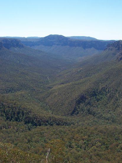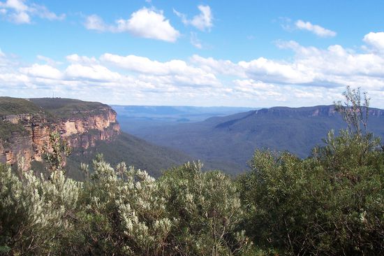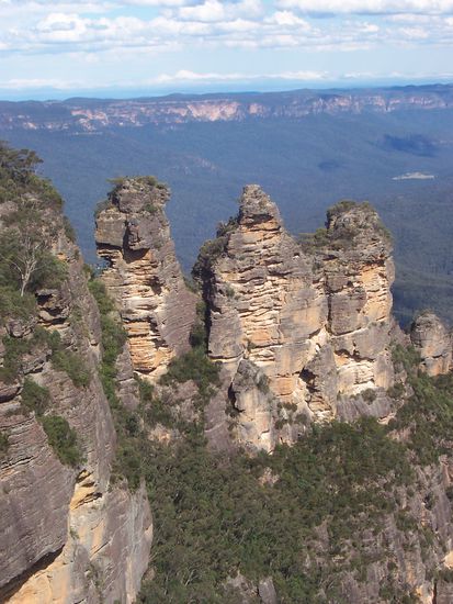 14.10.2007 Das letzte Wochenende hab ich mit einem Bekannten in den Blue Mountains verbracht. Wegen der kurzen Entfernung von Sydney ist es einer der meist besuchtesten Nationalparks in Australien. Die Landschaft ist sehr beeindruckend. Felsformationen, steile Abhaenge + Taeler, Wasserfaelle, unzaehlige Walking Trecks und Eukalyptusbaeme. Diese sind der Grund warum die Blua Mountains "blau" sind. Eine Kombination von Feuchtigkeit, Sonnenstrahlen und Oelabgabe hinterlaesst einen blaeulichen Schimmer.
