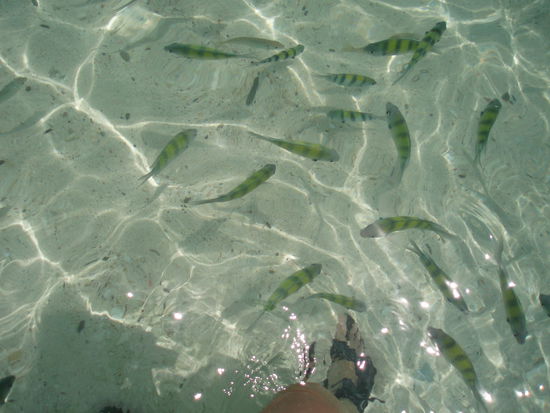 Freitag morgen sind wir also zum Treffpunkt und zum Pier. Dort wurde unser Longtailboot erst mal ne ganze Weile mit verschiedenen Sachen für eine geplante Party geladen. Nachdem das erledigt war, waren wir 20 Minuten später auf Lone Island, alles kam wieder raus aus dem Boot und wir sind weiter nach Coral Island. Zuerst waren wir in einer Bucht schnorcheln. Jede Menge kleine, bunte Fische - wie auch später direkt vom Strand aus. Dort wurden sie allerdings angefüttert. Und das alles in angenehm warmen Wasser macht schon Spass. Das einzig Ärgerliche war, als ich hinterher gesehen habe, dass meine Unterwasserkamera undicht war.