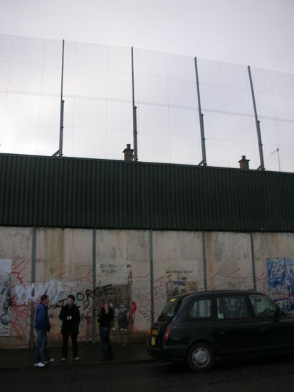 In der Ferne sieht man ein paar Überwachungstürme des Britischen Militärs und auf den Hügeln außerhalb von Belfast ist auch eine Überwachungsstation. Wie meinte unser Fahrer: "Hattet ihr Angst nach Belfast zu kommen? Nein? Das werden wir gleich ändern.". Na ja, ein komisches Gefühl war es auf jeden Fall und als "richtig geil" wie einige unserer deutschen Kommilitonen, würde ich die Tour jetzt auch nicht bezeichnen. Das ist ja schon fast Katastrophentourismus oder eben "Trouble Tourism". Weiter ging es zur Mauer, ironisch als "Peaceline" bezeichet. Sie ist circa 15m hoch, es gibt sie ins ganz Nordirland, die meisten in Belfast, und die letzte wurde vor 2 Jahren gebaut. Also von Frieden kann eigentlich kaum eine Rede sein. Und im Gegensatz zur Berliner Mauer will hier keiner, dass sie abgebaut wird, eher im Gegenteil. Nachts schließen sich sogar die wenigen Tore, weil sich sonst protestantische und katholische Kinder mit Flaschen und Steinen bewerfen und sich hassen, obwohl sie sich nicht kennen.