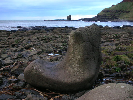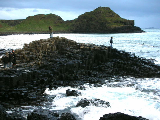 In Irland glaubt man natürlich lieber folgende Geschichte: Der nordirische Riese Finn MacCool wollte mit seinem schottischen Kontrahenten (keine Ahnung wie der jetzt hieß) kämpfen und hat ihm, ganz Gentleman, einen Übergang über den Atlantik gebaut, damit er zu ihm nach Nordirland herüberlaufen kann (den Giant's Causeway). Als Finn MacCool den schottischen Riesen und sein gefährliches Aussehen und seine enorme Größe gesehen hat, hat er jedoch Angst bekommen. Seine Frau hatte dann die Idee, Finn MacCool als Baby zu verkleiden und in eine Krippe zu legen. Als der schottische Riese ankam und nach Finn verlangte, meinte seine Frau, er sei nicht da, aber ob er nicht seinen niedlichen Sohn sehen wolle. Als der schottische Riese das Riesenbaby sah, malte er sich aus, wie groß wohl der Vater dann sein müsse, hat seinerseits Angst bekommen, ist zurück nach Schottland gerannt und hat dabei den Causeway zerstört, damit Finn ihm nicht folgen kann. Ja, so war's natürlich in Wirklichkeit!