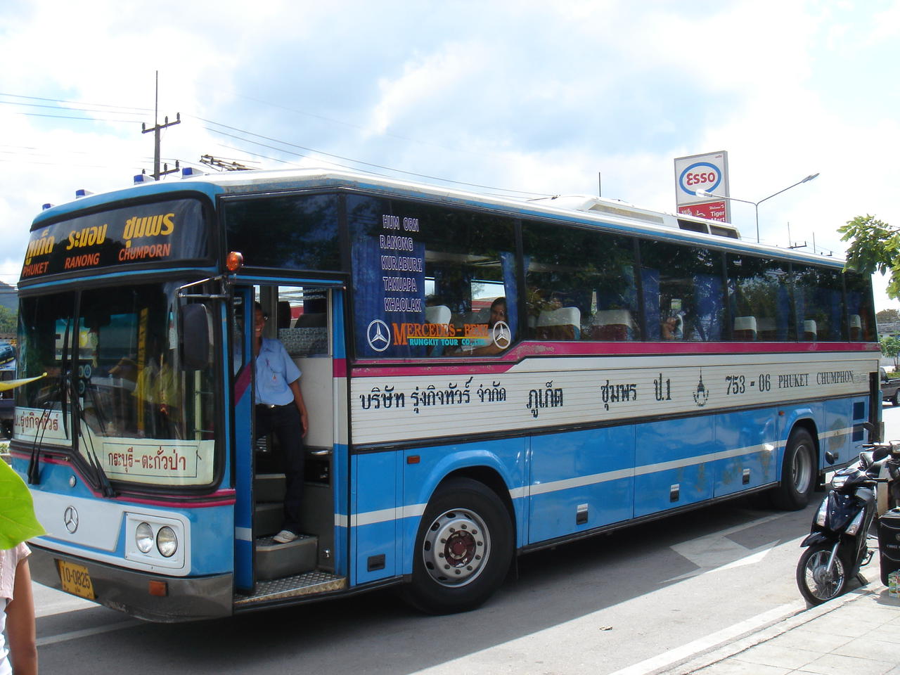 Unser Bus kam 'puenktlich' um 9h an. Wir hatten Glueck, es war ein AirCon-Bus und es gab erst noch zwei freie Plaetze fuer uns. Super, die Reise nach Ranong konnte losgehen. Reisetabletten haben wir bereits vor einer Stunde eingeworfen, was hiess, dass Rumpel auch sogleich fuer die naechsten paar Stunden wegschlummerte. Diese Travelsickness-Pillen wirken wie Schlaftabletten, man wird unglaublich muede. Die Fahrt dauerte exakt 5 Stunden inkl. Pipistop.