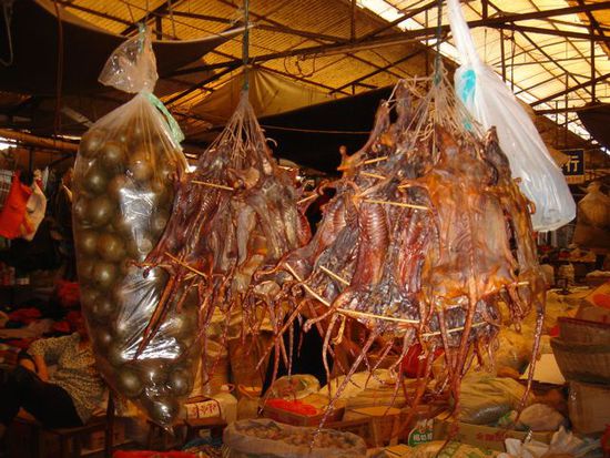 gegen abend begann unser kochkurs mit einer fuehrung ueber den lokalen markt. wer china kennt weiss, dass dies je nach markt nichts fuer schwache maegen ist. als wir im hintergrund die bellenden eingesperrten hunde hoerten, haben wir die fleischabteilung auch eiligst verlassen.