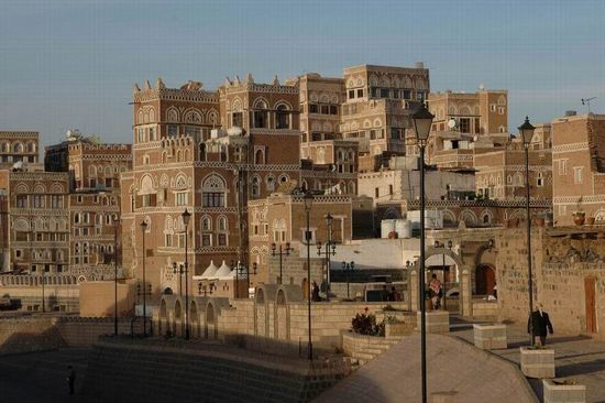 Liegt mitten im jemenitischen Hochland auf 2200 Meter. Im Osten und im Westen von hohen Bergen eingezäunt und vom Fluß Saila von Nord nach Süd durchflossen. Vielfältig und spontan ist die Architektur von Sanaa, so dass die Blicke immer wieder an den oberen Stockwerken und Dächern hängen bleiben. Die Häuser sind dicht aneinandergedrängt und teilweise abenteuerlich ineinander verschachtelt. Fensterbögen mit bunt ausgelegtem Fensterglas und geometrische Ornamente verzieren die Häuser. Reiche Häuser haben sogar doppelte Fensterbögen