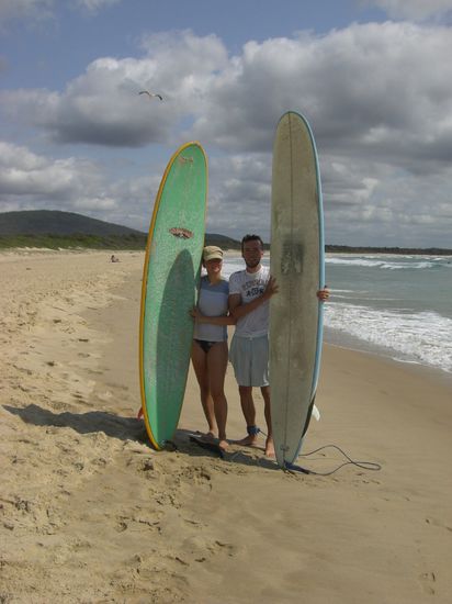 Nach einem kurzen Aufenthalt im Myall Lakes National Park war erstmal Surfen angesagt! In Crescent Head (sehr popularer Surfspot an der Ostkueste, vermutlich laengste Right-Hand-Welle der Welt) hatten wir ein paar nette aeltere Australier auf dem Campingplatz kennegelernt waehrend wir uns leckeres Kangaroo gegrillt haben. Nachdem ich (fast ) alle australischen Biersorten testen musste wurden wir eingeladen am naechsten Tag ein wenig Surfen zu lernen. Die Wellen waren genial und wir hatten eine Menge Spass mit den etwas angegrauten Surfern Bobby und Kevin.