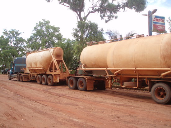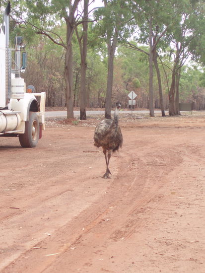 Australische Wahrzeichen am Musgrave Roadhouse: Roadtrain und Emu