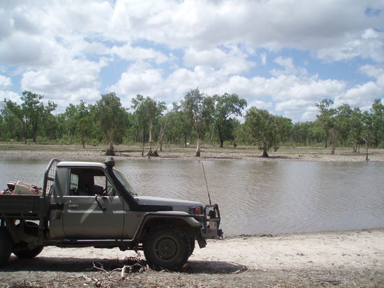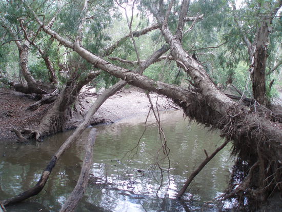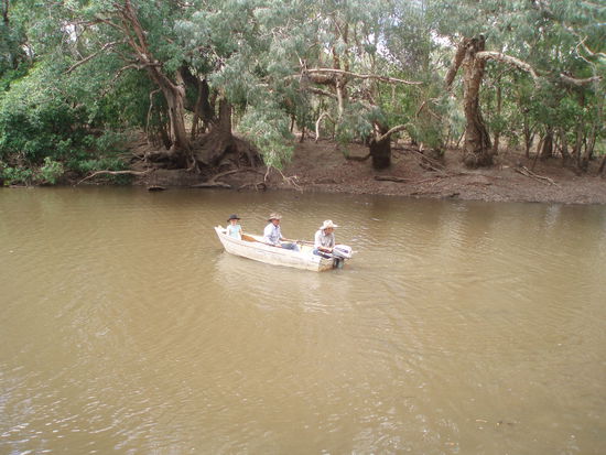 Die Creeks befanden sich ca. eine Stunde Fahrt vom Wohnhaus entfernt. Der Ausflug war sehr spannend, da nicht nur ein Barbecue auf offenem Feuer, sondern auch das Fangen von Krebsen und Muscheln auf dem Programm standen. Außerdem wollten G. und die Kinder ein Boot ausprobieren, das der Besucher in der Stadt gekauft hatte. Während der Bootsfahrt spannten sie ein großes Netz quer durch den Creek, um Fische zu fangen. Fische fingen sie nicht - doch dafür verirrte sich ein Krokodil in das Netz! Zum Glück gelang es den Männern, das Tier zu befreien und heil wieder an Land zu kommen. Es war auch nur ein relativ kleines gewesen, doch natürlich trotzdem nicht zu unterschätzen.