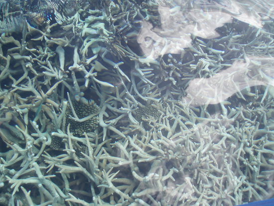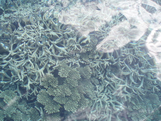 Nach einiger Zeit legte das Schiff wieder ab und nun ging es nach Hook Island in eine Felsenbucht. Hier gingen wir nicht an Land, sondern es wurde geschnorchelt. Die Tour im Glasbodenboot war um einiges länger als in Cairns und auch das Riff gefiel mir hier besser: Die Korallen befanden sich um einiges näher unter der Oberfläche. So konnte man sie sogar einfach so sehen, ohne störendes Glas dazwischen, denn das Wasser war sehr ruhig. Auch gab es hier einige riesige Fische, die einem laut schmatzend Futter aus der Hand nahmen.