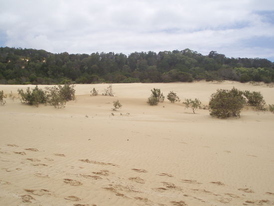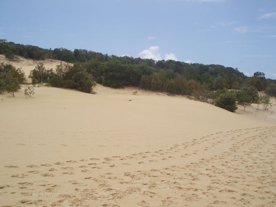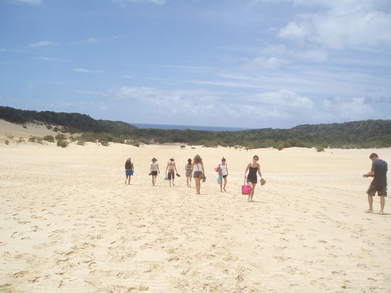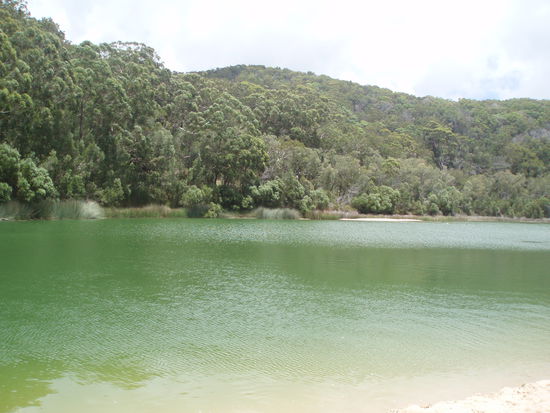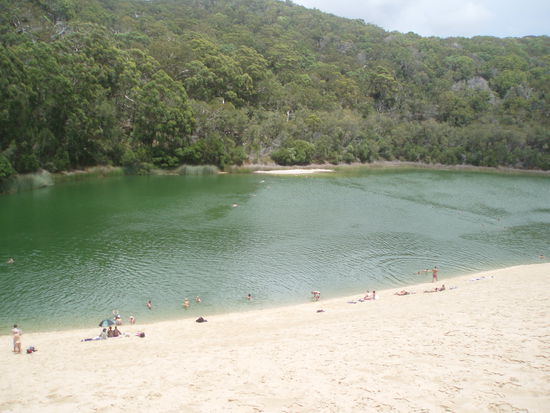 Als erstes wanderten wir durch den Regenwald zur Hammerstone Sand Blow, einer gigantischen Sanddüne. Sie musste man erklimmen, um zum Lake Wabby zu gelangen, einem stillen grünen See inmitten der Insel. Der schweißtreibende Aufstieg auf die Düne lohnte sich - der See war wunderschön und wir hatten genug Zeit, uns beim Schwimmen im klaren Wasser zu erfrischen.
