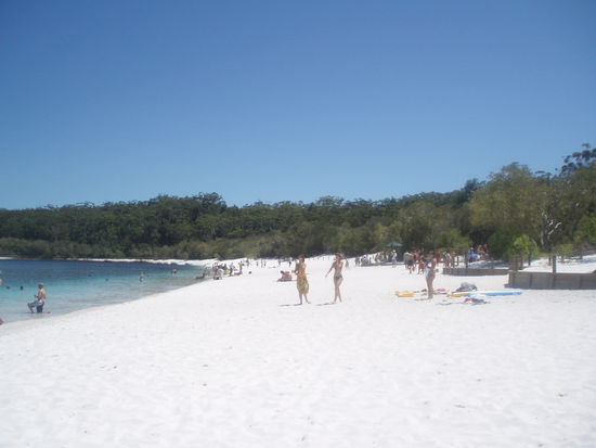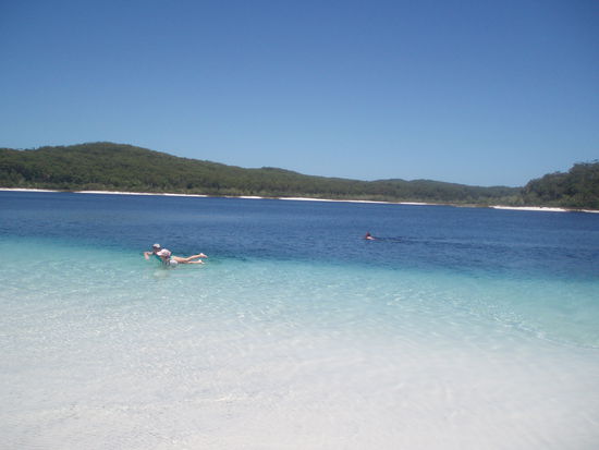 Nach einiger Zeit kamen wir am Lake McKenzie an. Dieser riesige, herrliche See liegt mitten auf einem Berg und ist der berühmteste von Frasers über hundert Seen. An Lake McKenzies natürlichem Strand tummelten sich die Touristen, doch hier störte es nur wenig. All die Menschen waren so glücklich und entspannt, dass man sich einfach ins kühle Wasser stürzte um die Hitze des Tages loszuwerden. Wir blieben hier über drei Stunden und genossen die Schönheit des Ortes, plantschten im Wasser und entspannten einfach. Das Wasser des Sees ist so klar, dass kaum Lebewesen darin zu finden sind, da es nicht genug Nährstoffe enthält! An diesem heißen Tag war es unglaublich erfrischend, und sogar ich, die ich wirklich keine Wasserratte bin, konnte nicht genug bekommen.