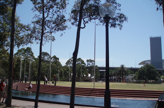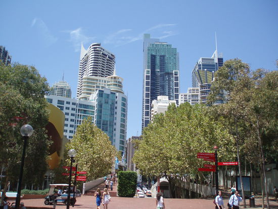 Darling Harbour liegt westlich der Innenstadt und war früher ein Hafenviertel. Während des 20. Jahrhunderts verfiel die Gegend immer mehr, wurde dann aber in den 1980er Jahren restauriert und verwandelte sich in ein schmuckes, konsumorientiertes Viertel und eine Touristenattraktion. Heute ist Darling Harbour also vor allem ein Ort zum Geld ausgeben: Geschäfte, Restaurants und Cafés aller Art tummeln sich hier rund um ein riesiges Shopping Center. Es gibt aber auch kleine Parks und Wasseranlagen, und man kann am ursprünglichen Hafen entlang spazieren.