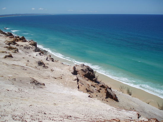 Doch Carlo Sandblow raubte mir dann komplett den Atem: Eine riesige Sandfläche inmitten des Waldes. Die Düne ist 120m hoch! Nach Süden hatte man einen wunderbaren Blick über den Wald und Rainbow Beach, nach Norden konnte man Wide Bay überblicken. Der Blick über den Ozean ließ mich beinahe schwindelig werden, so riesig war die strahlend blaue Wasserfläche.