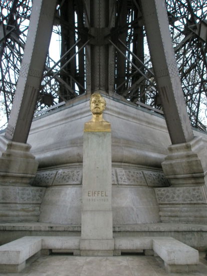 Unten, bei einem der "Füße", steht die Eiffelbüste, als Denkmal für den Erbauer.