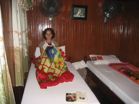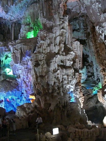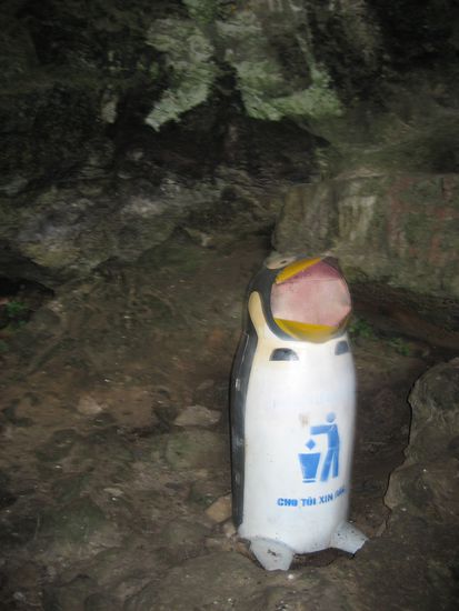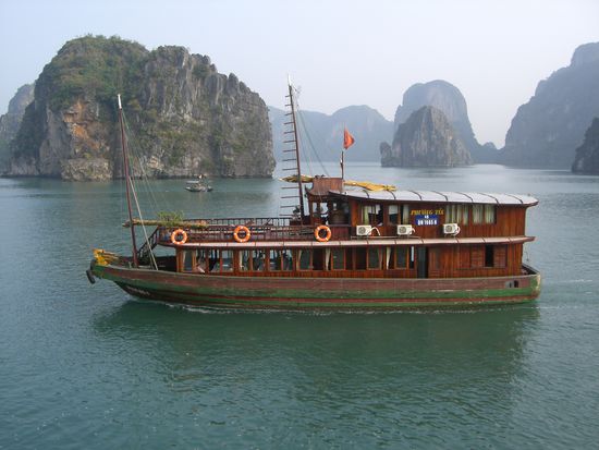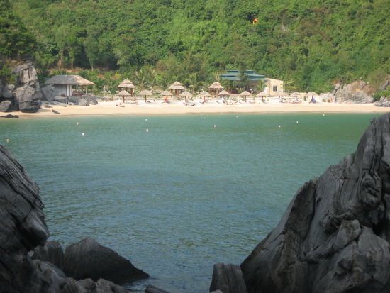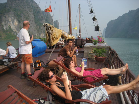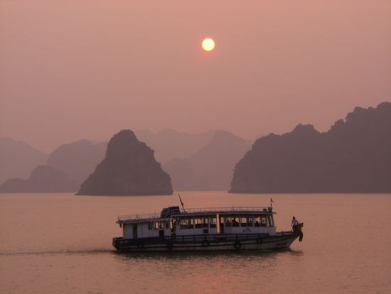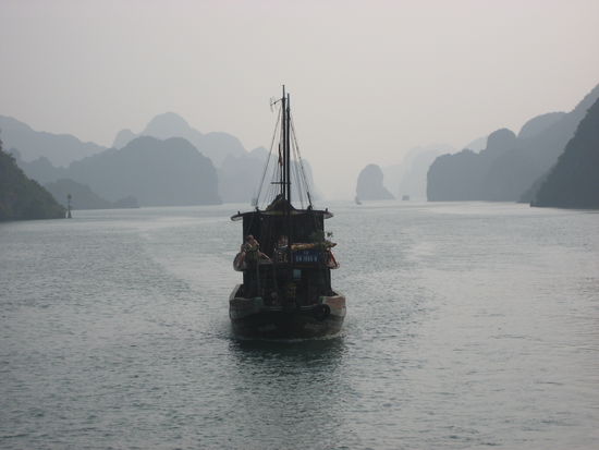 Die Freude aus dem stressigen Hanoi weg und zu der ruhigen Halong Bay zu kommen, wurde erstmal getruebt, als wir inmitten riesiger Touristenmassen am Hafen standen und warten mussten, bis wir unserem Schiff zugeteilt wurden. Kaum waren wir aber mit dem wirklich schoenen Holzschiff losgetuckert, wurden wir von der atemberaubenden Kulisse entschaedigt. Ueber 3000 Kalksteininseln ragen in bizarren Formen aus dem Meer und fuegen sich zu einem beeindruckenden Landschaftsbild zusammen. Die Atmosphaere hatte durch aufkommende Nebelschwaden was mystisches und Dank unserer sehr kleinen Reisegruppe von 14 Personen, wurde sie auch nicht gestoert. Viele der Felsen sind durchzogen von Grotten, und auch fuer uns stand eine Besichtigung der groessten Grotte Hang Sung Sog auf dem Touri-Programm. Wir koennen aber nicht verstehen, wie dieses Weltkulturerbe durch kitschig bunte Lichtkegel und grosse Muelleimer in Pinguinform so verschandelt werden kann. Unser Schiff ging fuer die Nacht in einer Bucht vor Anker, und wir hatten einen wunderschoenen und ganz entspannten Abend auf dem Deck, in Liegestuehlen unter einem Sternenhimmel und mit einer Flasche des obligatorischen Dalat-Rotweins. Wir koennen die Uebernachtung in der kuscheligen Kajuete, in der man am naechsten Morgen durch das stampfende Motorengeraeusch geweckt wird, unbedingt empfehlen. Den naechsten Tag verbrachten wir mit einer mehrstuendigen und krass anstrengenden Trekkingtour auf der Insel Cat Ba, von der wir uns am Nachmittag am schoenen Strand erholten. Nach einer Inseluebernachtung ging es auch leider schon zurueck, und Hanoi hatte uns wieder.