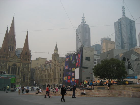 Melbourne ist eine schoene Stadt. Es gefaellt uns in unserem Viertel "St. Kilda", das direkt am Strand liegt, wirklich gut. Das Hostelleben im Schlafsaal und mit Selbstversorgung (Olembia Hostel, 25 A$) ist fuer uns noch ungewohnt, hat aber auch Vorteile, da man staendig neue Leute kennenlernt. Die Australier sind ein sehr offenes und nettes Volk, einer ihrer Lieblingsausdruecke ist "no worries" und danach leben sie auch. Ueberrascht hat uns das Wetter. Taegliche Schwankungen zwischen 40 und 20 Grad Celsius sind scheinbar normal. Nicht mormal ist der weisse Dunst, der in der ganzen Stadt haengt und die Ausgangswarnungen aufgrund riesiger Buschbraende die zu Zeit um Melbourne wueten. Daher nachfolgend leider nur "triste" Bilder.