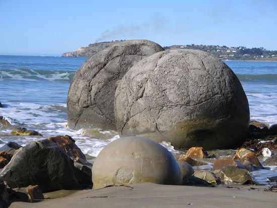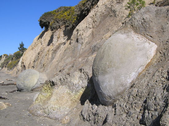 dadurch,dass die Brandung die Klippen "auswusch" fielen oder fallen die Kugeln aus den Schieferklippen