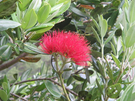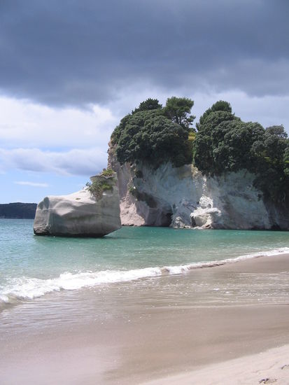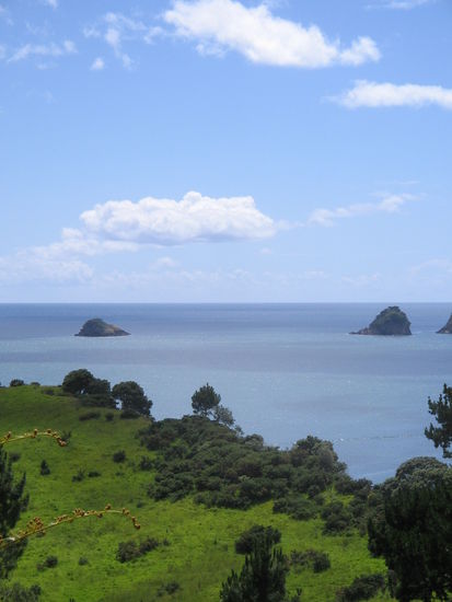 Als wir die Westkueste der Insel entlang fuhren schlaengelte sich die Starsse an der schmalen und felsigen Kueste entlang.Die Kuesten von Coromandel sind nicht einfach nur Fels-nee hier waechst und gedeiht der wunderschoene Pohutukawa-Baum,welcher auch als "Weihnachtsbaum" bezeichnet wird,da er immerium die Weihnachtszeit mit seinen roten Blueten uebersaeht ist.Ende Dezember scheint die Kueste zu gluehen,weil hier wirklich Baum an Baum waechst.