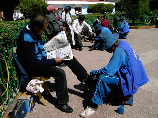 Am Plaza de Armas saßen wir einige Stunden, in der auf der Höhe ziemlich stark scheinenden Sonne. Direkt neben uns war einer von vielen Schuhputzern aktiv. Immer wieder schweifte mein Blick von meinem Spanisch-Vokabelheft in Richtung seiner geschäftigen Tätigkeit ab. Man selbst hätte vermutlich ein schlechtes Gewissen, sich für umgerechnet 12,5 Cent die Schuhe putzen, einfetten und bürsten zu lassen. Hier in Peru scheint das, ein reguläres wie selbstverständliches Business zu sein. Die Männer von jung bis alt, gehören alle einer Organisation an und tragen die gleichen blauen Westen. Der Hombre neben uns kramt mit seinen schwarzen, glänzenden Fingern in einer Tüte Cracker, als ein gepflegter Herr um die 50ig stillschweigend auf dem kleinen Hocker vor ihm Platz nimmt und seinen staubigen Lackschuh auf das kleine Podest stellt, ohne ihn dabei nur eines Blickes zu würdigen. Damit eine "entspannte Atmosphäre" herrscht, drückt der Schuhputzer seinem Kunden eine abgegriffene Zeitung in die Hand. Vielleicht drei Minuten später klopft er ihm kurz auf den nun polierten Schuh. Ein kurzer, prüfender Blick - der ältere Herr erhebt sich, wühlt in seiner Hosentasche, holt 50 Centimos heraus und überreicht die Münze einer sich ihm entgegenstreckenden, verschmierten Hand. Ohne einen Mucks zu sagen, zieht er von dannen. Der Hombre in der blauen Weste holt aus dem Schatten ein dort deponiertes Eis, schleckt daran und gönnt sich etwas Gutes nach getaner Arbeit.