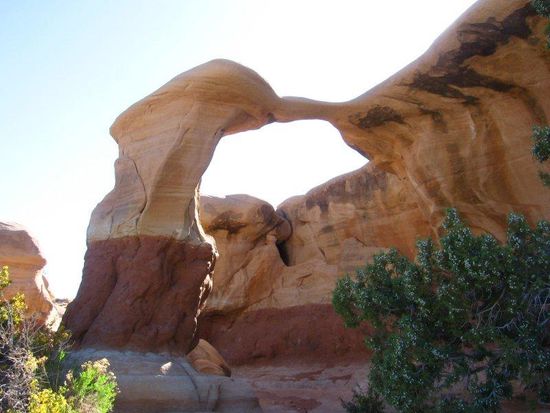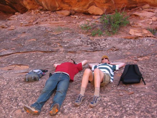 Der Trail zum Broken Bow Arch führt uns mal wieder über Sand hinab ins Tal. Ich freue mich schon jetzt auf den Rückweg. So sehr, dass ich mich erst einmal in den Schatten lege. Horst legt sich gleich mal neben mich. So liegen wir also da am Wegesrand, kaputt, vor lauter Erschöpfung, dabei sind wir noch nicht einmal wirklich losgelaufen. Jeder vorbeikommende Wanderer muss denken, wir wären schon längst auf dem Rückweg und drücken uns nur vor dem mächtigen Anstieg.