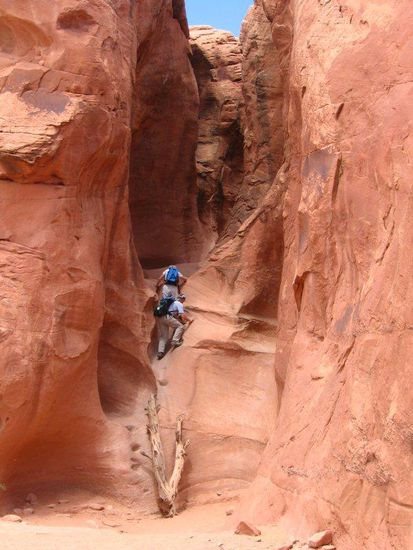 Ach, es geht doch nichts über einen Ordner voll gepackt mit Reiseberichtsausdrucken. Wie profitieren mächtig von den Erlebnissen anderer Leute. Vom Parkplatz den kleinen Sandhügel runter, ein paar Schritte geradeaus und wir stehen am Eingang zur Peek-A-Boo Gulch. Über eine 5-6m hohe Wand klettern wir in den kleinen Canyon. In den Felsen eingeschlagene Stufen erleichtern die Kraxelei. Dennoch stimmt hier etwas nicht mit der Reihenfolge. Hier bin ich sprichwörtlich mit dem falschen Fuß zuerst aufgestanden, so dass ich es in 2m Höhe noch einmal korrigieren muss und - geschafft!
