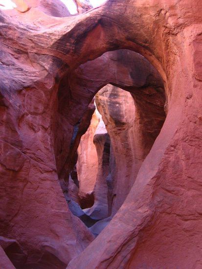 Wir laufen kurz rüber zur Spooky Gulch und versuchen auch hier unser Glück, mit möglichst wenig Schrammen viele Eindrücke zu sammeln. Obwohl auf dem Parkplatz so viele Autos stehen wie bei Aldi zum Schlussverkauf, ist's in den Canyons auffallend ruhig. Der große Andrang bleibt aus, so dass wir in Ruhe anhalten und fotografieren können. Wo sind die nur alle? Haben die den Eingang etwa nicht gefunden? Ist aber auch etwas tricky. Wir wissen, wir müssen an der Nordseite des Washes den Eingang zur Spooky Gulch suchen und nehmen auch zuerst nicht den offensichtlichen Weg, sondern suchen hinter jeden Busch nach einer versteckten Höhle.
