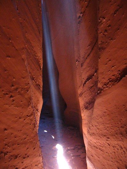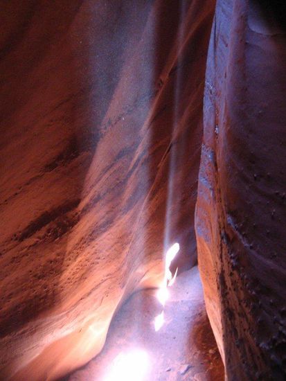 Aber wir beweisen mal wieder perfektes Timing, als wir den Spooky dann doch gefunden haben. Das Gemisch aus Anhalten zum gegenseitigen fotografieren und Schrammenzählen stimmt, so dass wir genau zur richtigen Zeit zu einem der seltenen Sun-Beams kommen. Anders als z.B. am Antelope Canyon fallen nur für Minuten Sonnenstrahlen zum Boden, die wir mit etwas aufgewirbelten Sand noch besser zur Geltung bringen.
