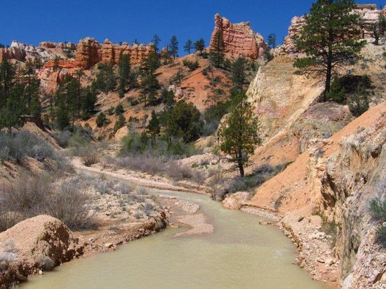 Vor dem Abzweig zum Bryce Canyon kommen wir bereits durch die Landschaft, für die der Bryce Canyon so berühmt ist. Gelb brauner Fels und grünes Nadelgewächs. Der Trail zu einer Höhle führt entlang eines Baches, was ein wirklich originelles Bild abgibt: Bryce Canyon mit Fluss.