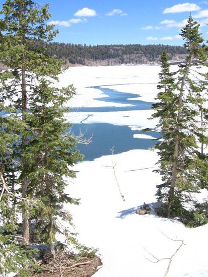 Wir biegen ab auf die Rundstraße um den See, die immerhin geräumt und damit befahrbar ist. Rechts und links türmen sich allerdings noch die Schneemassen auf, die nun langsam in der Sonne schmelzen. Das Schmelzwasser sammelt sich in Schlaglöchern auf der Straße und vermischt sich dort mit Sand und Dreck. Und jedes mal, wenn wir durch eben so ein Schlagloch fahren, von denen es genügend gibt, so dass nur die Elch-Test-Fahrer ihnen ausweichen könnten, verpassen wir unserem Auto eine weitere Portion Lehmschicht. Inzwischen können wir getrost behaupten, wir fahren einen braunen Wagen mit weißem Dach. Auch Befürchtungen, es könnte unheimlich stauben, wenn man den Kofferraum zuklappt, sind vom Tisch. Was inzwischen unser Auto bedeckt, das staubt nicht mehr, sondern es pappt. Den Wagen ziert eine braune Lehmschicht, so als ob er zu lange im Solarium gewesen ist.
